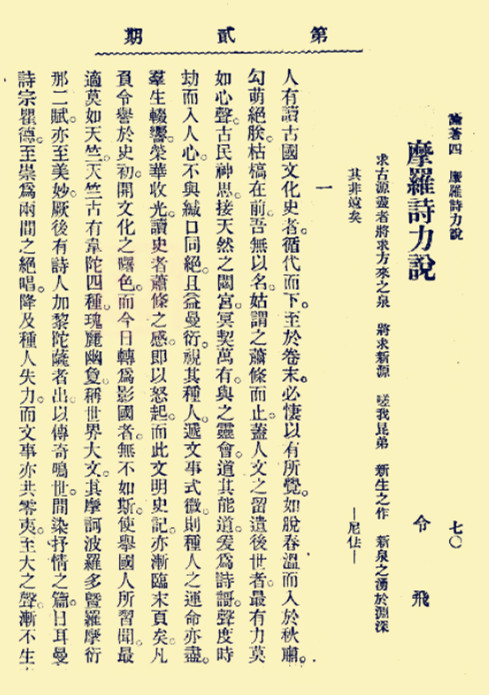 發(fā)表于《河南》雜志1908年第2期的《摩羅詩力說》,署名令飛
