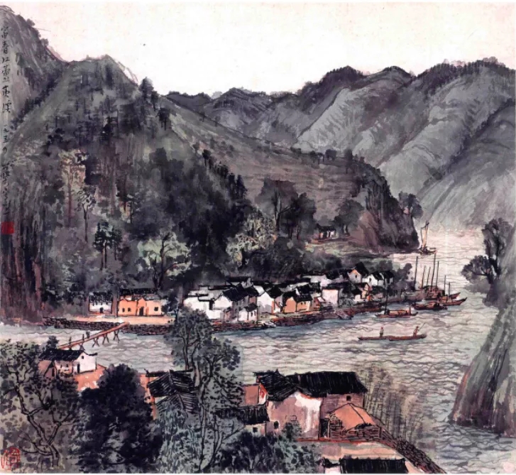 船沿長江上駛時,大家在艙板間眺望著寬逾十里的廣闊江面,但見波平如鏡,兩岸煙樹齊平,和淡紫色天際相接,溶成一片,臨水城鎮(zhèn)房屋和江邊寄泊船只,嵌到這個背景中,都和畫里一般。但是從古人著名繪畫中,卻找不出任何一幅畫更能夠這么給人以“大好河山”的深刻感人形象。[35]