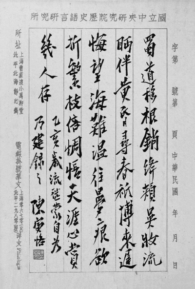 1948年12月,平津戰(zhàn)役激烈進行,清華園內(nèi)人心惶惶。南京政府?dāng)M定了一個所謂“搶救計劃”,組織北平學(xué)者南遷,陳寅恪是被接的重點人士。但此時他對國民黨政權(quán)已十分失望,不愿再與其合作。正在猶豫之間,他的妹夫、時任國民黨交通部長的俞大維催促他離京。俞大維估計北平會有一戰(zhàn),他擔(dān)心陳寅恪一家的安全,特捎來口信,要陳寅恪務(wù)必隨胡適一起搭乘飛機離京。倉促中,陳寅恪只帶了簡單的行李,于12月15日和家人一起在南苑機場搭上了南下的飛機。陳寅恪百感交集,途中賦詩一首,其中一句為“去眼池臺成永訣”,表明這一去,可能很難再回古都了。