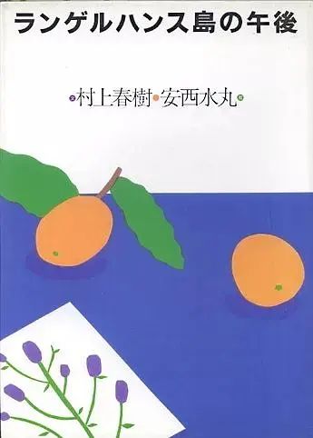 水丸注意到,佐佐木為村上畫(huà)的封面是色塊構(gòu)成,沒(méi)有描線。所以他去掉了自己的插畫(huà)一貫以來(lái)最個(gè)性的描線?!度ブ袊?guó)的慢船》上半部分是白色,印了書(shū)名,下半部分是藍(lán)色底色上的白盤(pán)子,里面有兩只茶色的梨。加上陰影,一共七個(gè)顏色。深棕、淺棕、茶色、黃色、白色、天藍(lán)、海藍(lán)。蘊(yùn)含了安定和不可思議的一幅。白與藍(lán)的分界既可看作是桌面,又是水丸作品中永恒的故鄉(xiāng)的海平線。多年后仍有年輕插畫(huà)師告訴安西,自己當(dāng)初就是看到這個(gè)封面才決心投身插畫(huà)界。