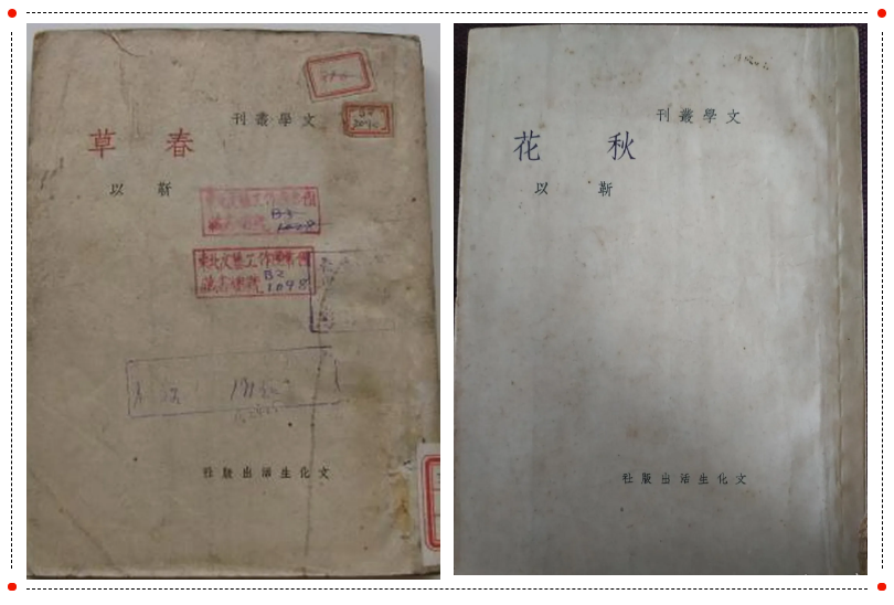 靳以的小說《秋花》和《春草》,是一對姊妹花?!肚锘ā妨腥氚徒鹬骶幍摹拔膶W(xué)叢刊”第二集,《春草》列入第八集,分別于1936年8月和1946年4月,由文化生活出版社初版。這是兩部連續(xù)性的中篇小說,《春草》是《秋花》的續(xù)集,小說中的人物是一致的,表達(dá)的主題也是一樣的。