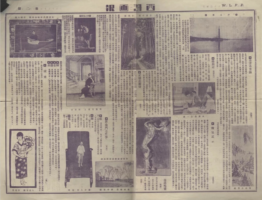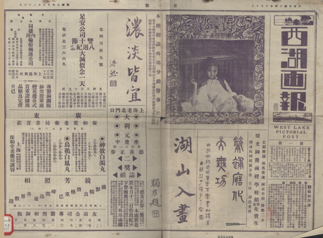 該畫報雖以西湖命名,但內(nèi)容卻不局限于西湖,涉及繪畫、電影、戲劇、文學(xué)作品及人物小傳等諸方面。創(chuàng)刊號一版有刊頭照片、訂報價目、廣告價目、編輯余沈和各界人士的祝詞,其余均為廣告;二版文字有舊夢的《紀(jì)新聞學(xué)會》、含涼的《行春橋串月》、寄塵的《記斷鴻零雁》、徐碧波的《酸氛記》、煙橋的《西湖的種種》等;圖畫有《錢塘怒潮》《塔影湖光》等風(fēng)景名勝圖片,《慈愛》《田家家趣》等攝影作品,《月下》《朝曦》等繪畫作品,以及天一公司影片《立地成佛》的劇照。第二期中,文字有頹唐生的《趣刑記》、嫩波的《記韓莊新臠》、風(fēng)廠的《說栗》、含涼的《新“開門七件事”》等;圖畫有《浮玉塔》《云溪竹徑》等西湖景色圖片,《人比花嬌》《曼殊遺跡畫》《題籟鳴畫》等繪畫作品,《鏡中人影》等攝影作品,以及北京著名鼓娘金秀蘭、影星王慧仙、名妓樊梨花老九的照片和影片《秋扇怨》的劇照等。