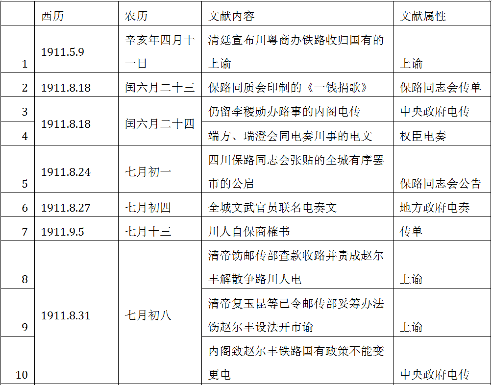 值得注意的是,在引用文獻(xiàn)中占絕大多數(shù)的是所謂官方文件,包括直接來自清帝或內(nèi)閣的上諭、批復(fù)的傳電(7筆)、和路事相關(guān)的權(quán)臣的電奏(1筆),以及四川總督趙爾豐、擬繼任川督岑春煊發(fā)布的告示等來自地方政府的文件(6筆),共16筆,占總數(shù)近四分之三。在此不妨將這類文件看作官方的意旨,它們傳達(dá)了來自最高統(tǒng)治者的絕對命令,但更多情況下代表的是把持實際統(tǒng)治權(quán)的皇族內(nèi)閣以及朝廷命臣的意志:從慶親王奕劻到鐵路國有政策的策劃者、郵傳部長盛宣懷,乃至督辦川漢、粵漢鐵路的大臣端方一線。此外,則是趙爾豐政府對市民的直接統(tǒng)治。對官方話語的直接引述,毋庸說構(gòu)成了小說想要展現(xiàn)的清末四川權(quán)力斗爭格局中具有前提意義的一極。在小說中,這些政治話語之所以可以進(jìn)入成都普通市民的生活,憑靠的是近代以來迅猛發(fā)展起來的大眾傳媒網(wǎng)絡(luò)。