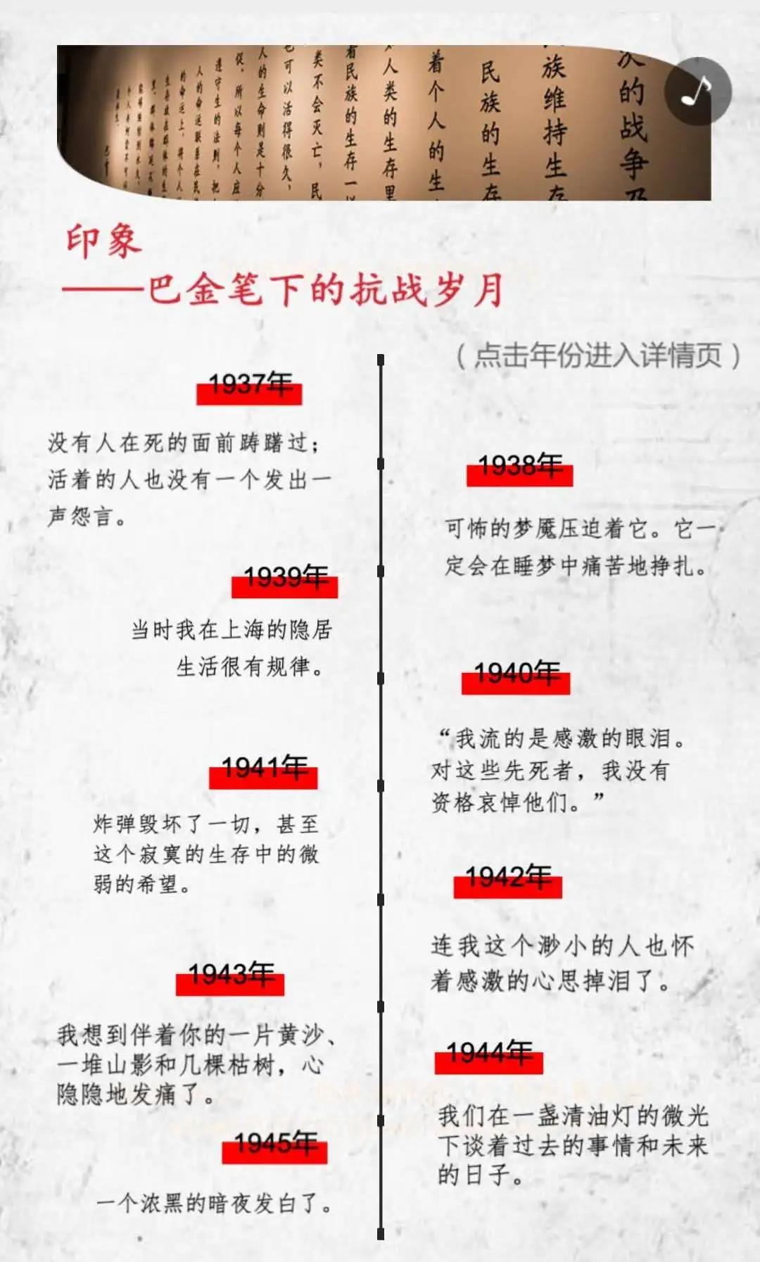 主要展示抗戰(zhàn)期間巴金的行動軌跡和經(jīng)歷而始,通過一個作家的角度,反應(yīng)一個個歷史斷面,反映了一個時代的風(fēng)貌,塑造堅持信念、戮力抗戰(zhàn)的作家群像。