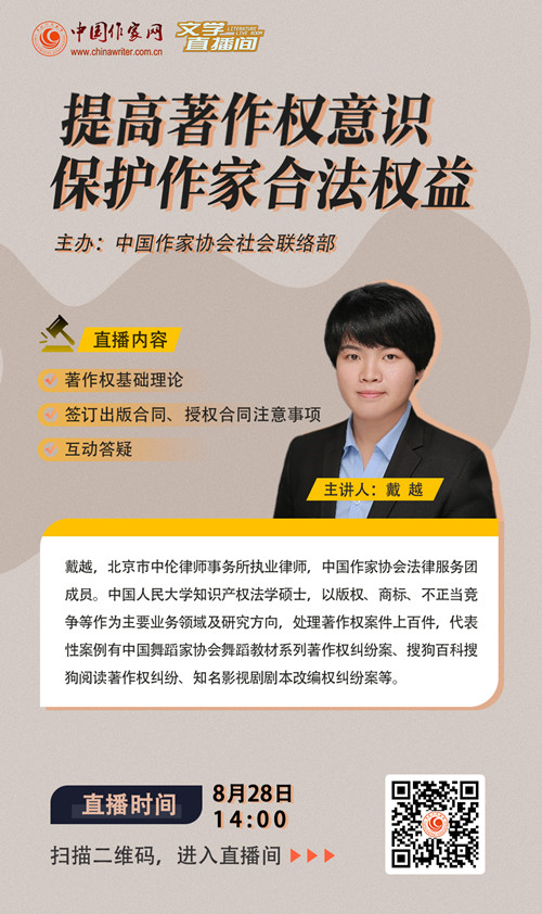 8月28日14時(shí),由中國(guó)作家協(xié)會(huì)社會(huì)聯(lián)絡(luò)部主辦的“提高著作權(quán)意識(shí) 保護(hù)作家合法權(quán)益”主題網(wǎng)絡(luò)直播講座在中國(guó)作家網(wǎng)“文學(xué)直播間”開(kāi)播。主講人中國(guó)作協(xié)法律服務(wù)團(tuán)成員、北京市中倫律師事務(wù)所律師戴越就著作權(quán)基礎(chǔ)理論、簽訂合同注意事項(xiàng)等與作家權(quán)益密切相關(guān)的內(nèi)容,結(jié)合實(shí)務(wù)作出講解并現(xiàn)場(chǎng)答疑,中國(guó)作協(xié)、各省市作協(xié)、行業(yè)作協(xié)會(huì)員及文學(xué)愛(ài)好者累計(jì)近萬(wàn)人收看了直播,并在直播間進(jìn)行了熱烈的留言討論。