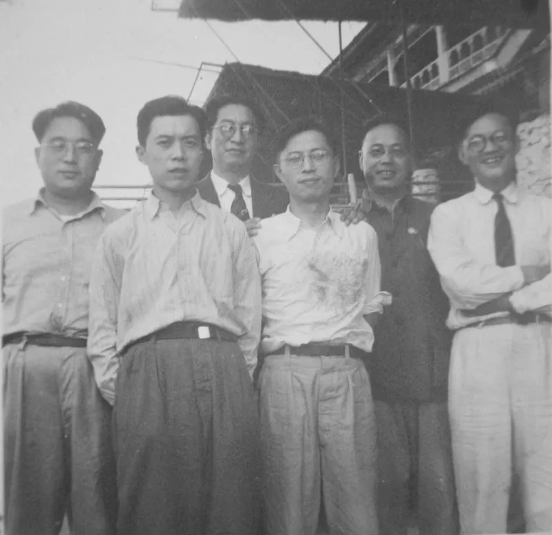 1949年7月第一次文代會期間,巴金與李健吾等友人攝于北京北海(左起:靳以、陸申、鄭振鐸、曹禺、李健吾、巴金)
