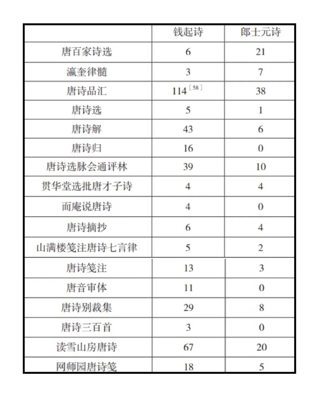 綜上所述,唐詩(shī)選本對(duì)于唐詩(shī)小家的影響是形形色色、利弊參半的。但從總體來(lái)看,在長(zhǎng)達(dá)千年的唐詩(shī)接受史上,選本對(duì)小家作品的保存、傳播以及小家名聲的免于湮沒(méi)起著相當(dāng)積極的影響。尤其重要的是,小家們?cè)谔圃?shī)史上的地位之確立,選本起著決定性的影響。試看一例。大歷詩(shī)人錢(qián)起與郎士元生前齊名,唐德宗貞元初年(785年),高仲武在《中興間氣集》的錢(qián)起小傳中云:“士林語(yǔ)曰:‘前有沈宋,后有錢(qián)郎。’”[57]此時(shí)錢(qián)、郎去世未久,可視為詩(shī)壇對(duì)二人的蓋棺論定之評(píng)。北宋歐陽(yáng)修、宋祁的《新唐書(shū)·文藝傳》中轉(zhuǎn)述此語(yǔ),可見(jiàn)后人對(duì)此種評(píng)價(jià)的認(rèn)同。有趣的是,在唐代的唐詩(shī)選本中,《中興間氣集》對(duì)二人之詩(shī)各選12首,《極玄集》對(duì)二人之詩(shī)各選8首,此外僅有《才調(diào)集》選錢(qián)詩(shī)1首而未選郎詩(shī),可見(jiàn)在唐代選家的心目中,錢(qián)、郎二人確是旗鼓相當(dāng)??墒堑搅撕蟠X(qián)、郎入選唐詩(shī)選本的多寡程度漸行漸遠(yuǎn),試據(jù)歷代較重要的唐詩(shī)選本列表如下: