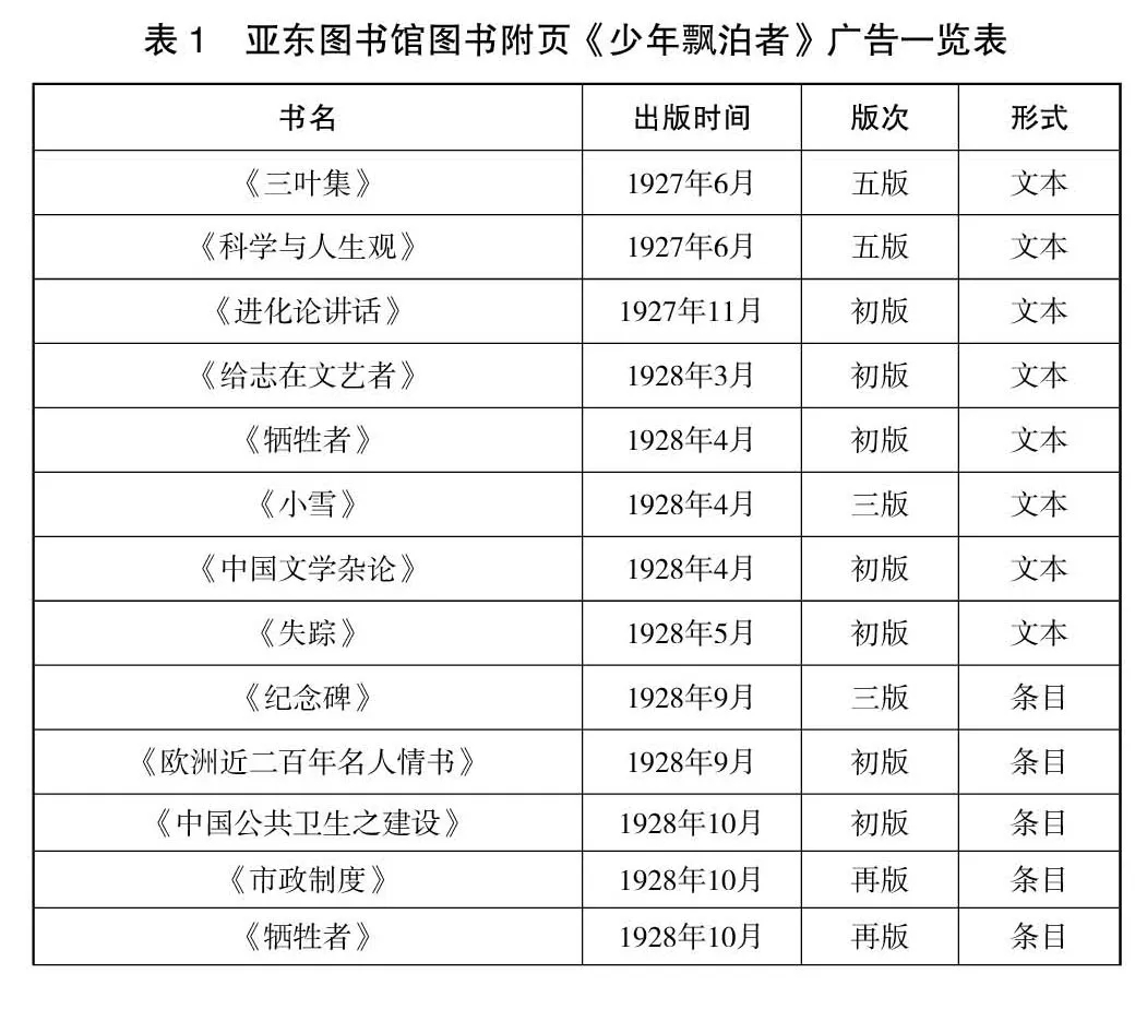 亞?wèn)|圖書(shū)館有把新書(shū)廣告置于其他圖書(shū)書(shū)后附頁(yè)進(jìn)行宣傳的慣例。與大報(bào)廣告相比,書(shū)后附頁(yè)廣告在經(jīng)濟(jì)性上有很大優(yōu)勢(shì),它將圖書(shū)整數(shù)印張排不滿(mǎn)的空白部分或另加頁(yè)來(lái)印刷廣告,既節(jié)約印刷成本,又能持續(xù)宣傳?!渡倌觑h泊者》含有文本的廣告出現(xiàn)在《三葉集》《嘗試集》等眾多書(shū)后附頁(yè)上。未列出文本,作為“創(chuàng)作與翻譯的小說(shuō)”“創(chuàng)作的小說(shuō)”“愛(ài)好文藝者的良好讀物”“書(shū)信”等類(lèi)別列出書(shū)名條目的廣告,出現(xiàn)在其所出版《紀(jì)念碑》《鴨綠江上》等書(shū)后,這些都是亞?wèn)|圖書(shū)館的暢銷(xiāo)圖書(shū),版次多,發(fā)行量大,且讀者對(duì)象穩(wěn)定,宣傳的針對(duì)性和系統(tǒng)性強(qiáng),極大地提升了《少年飄泊者》的知名度。