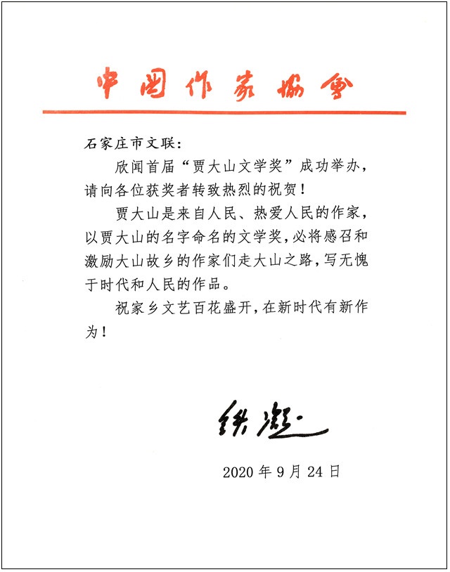 鐵凝在賀信中說(shuō):欣聞首屆“賈大山文學(xué)獎(jiǎng)”成功舉辦,請(qǐng)向各位獲獎(jiǎng)?wù)咿D(zhuǎn)致熱烈的祝賀!賈大山是來(lái)自人民、熱愛(ài)人民的作家,以賈大山的名字命名的文學(xué)獎(jiǎng),必將感召和激勵(lì)大山故鄉(xiāng)的作家們走大山之路,寫(xiě)無(wú)愧于時(shí)代和人民的作品。祝家鄉(xiāng)文藝百花盛開(kāi),在新時(shí)代有新作為!