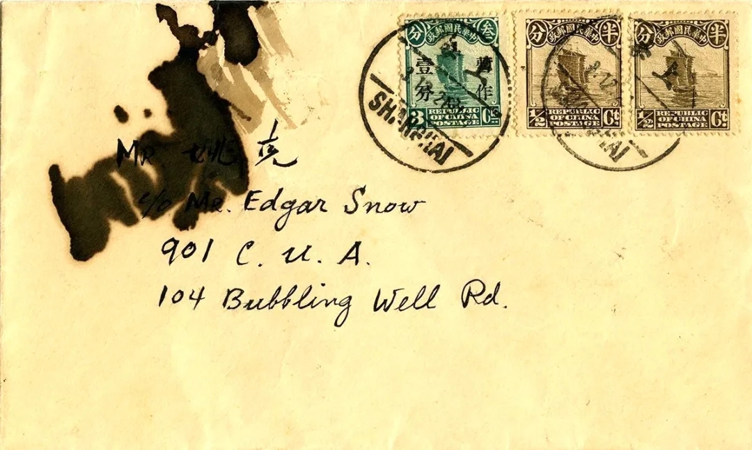 除了三十三封信箋,另有幾個已經找不到當年信箋的空信封,其中一件用毛筆豎寫著“本埠麥特赫斯托路四十巷第七號 姚莘農先生 周寄 五月二十八日”,比普通信封略大,像是寄賀卡用的。另一件用小楷毛筆橫寫著靜安寺路的英文地址,雖然不小心被墨汁弄污,仍可辨認出姚克中文名與Edgar Snow的英文名共俱其上。最后一件,用鋼筆豎寫著“棋盤街商務印書館編譯部 姚莘農先生 周喬峰 寄 六月二日”。