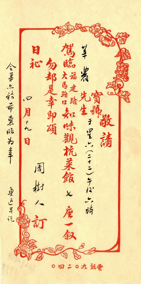 很快,就在先生回信的字里行間,讀者領會到這位年輕人的熱情、執(zhí)著和認真勁兒。魯迅告知自己的時間表,雖繁忙而欣然接受短暫見面,答復問題。同時知悉先生做事的細致和周全。剛剛寄去請柬,即刻再度寫信告知。一次設在大馬路石路知味觀杭菜館的隆重宴請行將開始,主要客人是“莘農先生”及“令弟”(即姚志曾)。