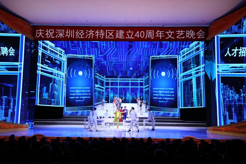 高科技是深圳的特色,源自深圳的科技元素也在晚會上展現(xiàn)得淋漓盡致。從音樂、舞蹈到舞臺美術(shù)、串場短片,晚會始終圍繞一個“新”字,用創(chuàng)新的藝術(shù)手段表達深圳的創(chuàng)新精神。在舞臺設計上,晚會充分利用了深圳大劇院舞臺的縱深空間,首創(chuàng)打造出一個縱深近50米的立體舞臺。舞臺空間由主功能屏、移動側(cè)屏和視窗圍合的立體表演區(qū)組成,輔以手持流動屏幕、矩陣屏、單體投影等呈現(xiàn)手段,形成方正大氣、天地一體的全方位、多層次、多景別呈現(xiàn)形態(tài),營造出裸眼3D立體視覺環(huán)境。觀眾紛紛表示,晚會“呈現(xiàn)出令人震撼的視覺奇觀”“讓我目不暇接”。