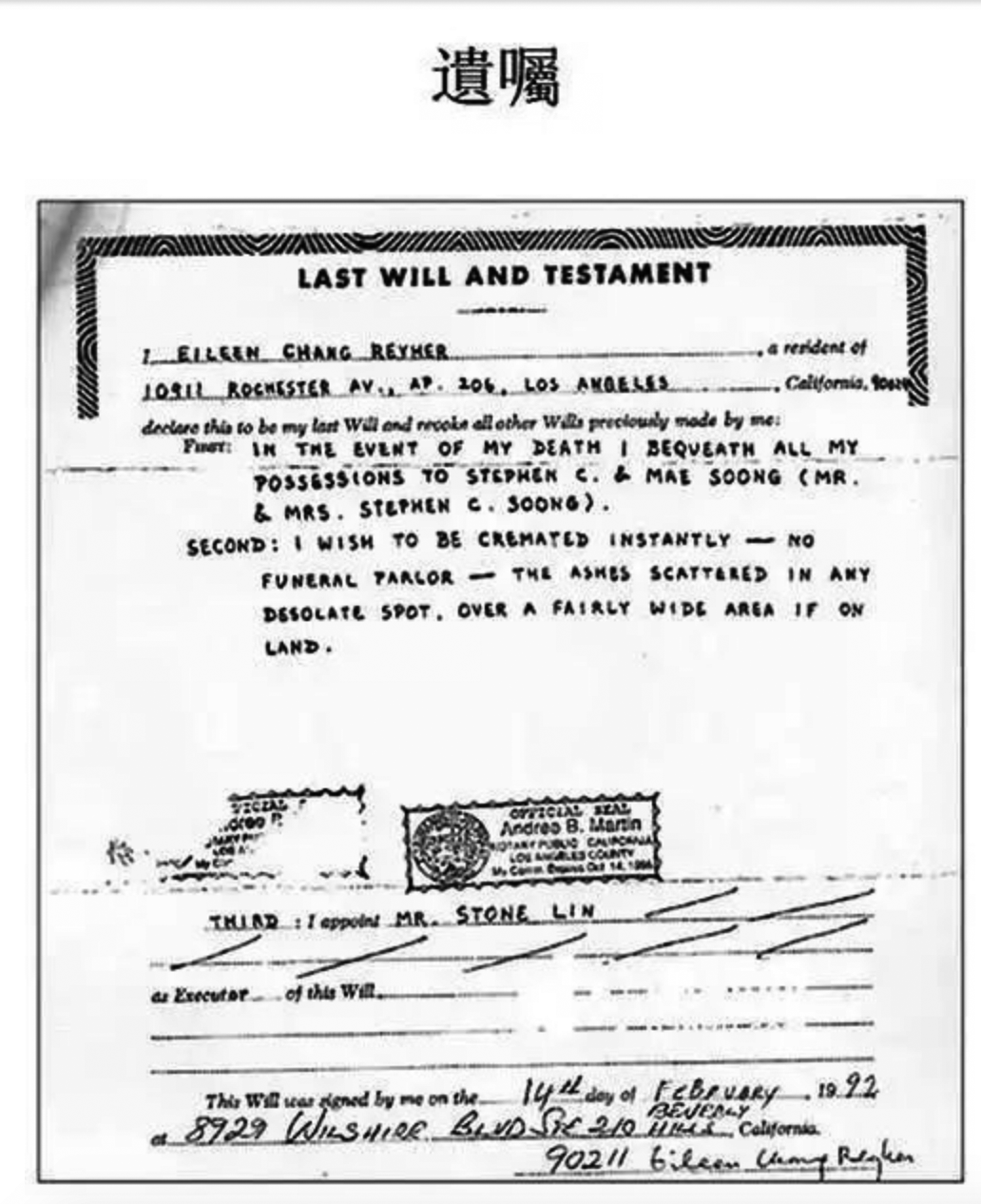公證人確認(rèn):“EILEEN CHANG REYHER 在簽署遺囑時(shí)心智健全,而且不是被迫,也沒有受到威脅、欺詐和任何人的不當(dāng)影響。”即給這份遺囑簽了字。簽完這份遺囑后,她給林式同寫信,附上遺囑影印件,說(shuō)了這件事,林式同還以為她得了什么不治之癥,打電話問(wèn)她,她說(shuō)身體尚好,只是以防萬(wàn)一[15]。24日簽下的遺囑,25日她即將正本寄給宋淇夫婦,同時(shí)寫了以下囑托: