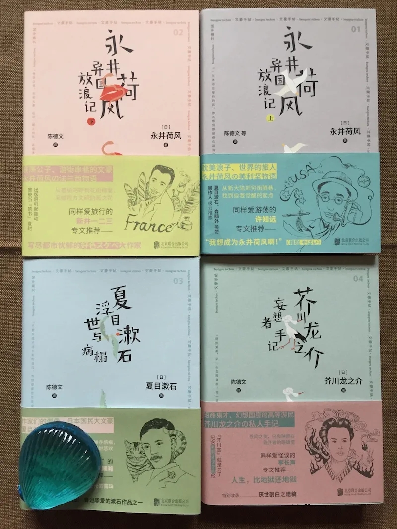 另一家我想到的蠻有日系文庫范兒的出版機構(gòu),是剛起步未久的一頁(folio)。這家社新近出品的“文豪手帖”叢書(全四種),分別為永井荷風(fēng)的《美利堅物語》和《法蘭西物語》,夏目漱石的《浮世與病榻》及芥川龍之介的《妄想者手記》(四種均為陳德文譯,北京聯(lián)合出版公司2020年7月版),文庫版開本自不在話下,從封面到書衣,從和風(fēng)環(huán)襯到編號等要素,真與角川文庫的純文學(xué)系有得一比。盈握在手的瞬間,人就被治愈了。