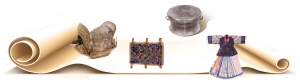 從左到右依次為蒙古族鎏金鏤雕龍紋馬鞍。漢代織錦“五星出東方利中國”錦護(hù)膊。壯族銅鼓。20世紀(jì)20年代的苗族女盛裝。