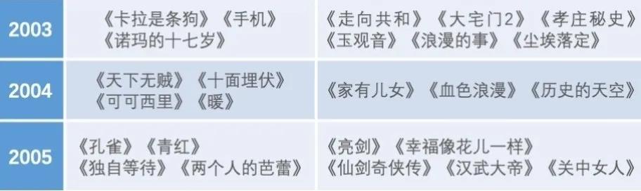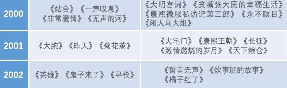 在明確中國現(xiàn)代Ⅱ第二波具有流動回溯的現(xiàn)代性這一特質(zhì)以及影視藝術(shù)在人生情境體驗(yàn)營造上的美學(xué)特長的交叉點(diǎn)上,可以更清晰地觀察21世紀(jì)初中國影視潮的狀況。從下列表格的簡要列舉,可以對這二十年中國影視潮中的部分作品作一次匆匆瀏覽: