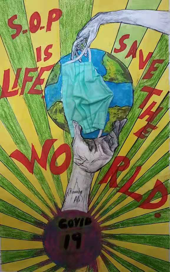 “Save the world”,一雙手為地球戴上了口罩;背靠多國國旗,身著防疫服的醫(yī)護(hù)人員將被捆綁的病毒微粒踩在腳下,將其清理鏟除;烏茲別克斯坦和中國兩國齊心抗疫,“我們一起贏”。