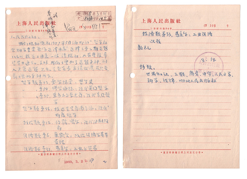 我們根據(jù)您社1957年5月編印的“哲學(xué)社會(huì)科學(xué)重要著作選譯目錄”選擇了第二期選題146個(gè),茲送上目錄一份,請(qǐng)核收。如有重復(fù),希望早日通知。另外,我們?cè)黾恿诉x題8種,列入名著選題,不知是否妥當(dāng),亦請(qǐng)考慮欣告。新增的8種如下: