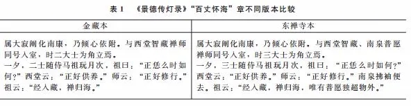 由以上數(shù)例可以看出,“非實(shí)質(zhì)性異文”是在刊刻流傳過程中由于字形、字音等因素形成的異文,對(duì)于此類異文,可以利用文字、音韻、避諱等小學(xué)知識(shí),判裁其正誤,并最終確定一個(gè)正確的異文。而對(duì)于下面這些“實(shí)質(zhì)性異文”,則很難用小學(xué)的方法抉擇出一個(gè)“正確”的文本,如卷6“百丈懷?!闭拢ㄒ姳?)。