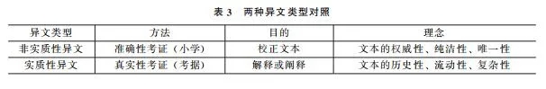 通過《景德傳燈錄》的具體例證可以看出:在文本的對(duì)校中會(huì)出現(xiàn)兩種異文,“實(shí)質(zhì)性異文”和“非實(shí)質(zhì)性異文”。此兩類異文普遍存在于校勘實(shí)踐中,但對(duì)兩類異文的處理與關(guān)注,中西方存在著比較大的差異。我國由于進(jìn)入印刷時(shí)代較早,保存的抄本、寫本相對(duì)較少,所以異文中“非實(shí)質(zhì)性異文”所占比重較大,而在處理“非實(shí)質(zhì)性異文”方面積累了豐富的經(jīng)驗(yàn)與技術(shù),借助于文字學(xué)、音韻學(xué)、訓(xùn)詁學(xué)等小學(xué)的知識(shí),大量的“非實(shí)質(zhì)性異文”可以得到解決。然而,由于印本時(shí)代典籍的整齊化過程,大量的“實(shí)質(zhì)性異文”已被消除,多數(shù)典籍文本趨于整齊,可以說很長的時(shí)間內(nèi),“實(shí)質(zhì)性異文”并沒有受到傳統(tǒng)校勘學(xué)的足夠關(guān)注。20世紀(jì)以來,簡(jiǎn)牘、帛書、敦煌文書、黑水城文獻(xiàn)、日本古抄本等文獻(xiàn)的陸續(xù)發(fā)現(xiàn),使我們得以重見抄本時(shí)代的典籍文獻(xiàn),也使我們知道,典籍整齊化之前存在著大量的“實(shí)質(zhì)性異文”。而這些“實(shí)質(zhì)性異文”既不能從典籍內(nèi)部通過小學(xué)的方法得以解決,也無法全部抉擇出最佳文本,定于一尊。只有將文化環(huán)境、意識(shí)形態(tài)、權(quán)力機(jī)制考慮進(jìn)去,才能解釋這些異文產(chǎn)生的機(jī)制,對(duì)這些異文進(jìn)行合理的闡釋。也就是說,對(duì)于“非實(shí)質(zhì)性異文”可以運(yùn)用文字、音韻、訓(xùn)詁等小學(xué)的方法,通過“準(zhǔn)確性”考證,最終校正錯(cuò)謬,整理出一個(gè)“正確”的文本。而對(duì)于“實(shí)質(zhì)性異文”,則需要綜合運(yùn)用考據(jù)學(xué)的方法,進(jìn)行“真實(shí)性”考證,對(duì)異文產(chǎn)生的文化環(huán)境、意識(shí)形態(tài)及權(quán)力機(jī)制進(jìn)行分析,弄清異文產(chǎn)生的機(jī)制。對(duì)于此類異文,或許最終無法決定異文的正誤,進(jìn)言之,這些異文本身其實(shí)并無“正誤”之分,而只是不同知識(shí)譜系中的形成物。對(duì)于“非實(shí)質(zhì)性異文”,可以通過校正錯(cuò)誤得到正解;而對(duì)于“實(shí)質(zhì)性異文”,只能通過對(duì)比作出解釋。“非實(shí)質(zhì)性異文”的處理實(shí)際上是對(duì)文本權(quán)威性、純潔性、唯一性的追求;“實(shí)質(zhì)性異文”的處理則是對(duì)文本歷史性、流動(dòng)性、復(fù)雜性作出的分析與描述(見表3)。而要發(fā)現(xiàn)、解決文本歷史性、復(fù)雜性的問題,則需借助于文本的考古。