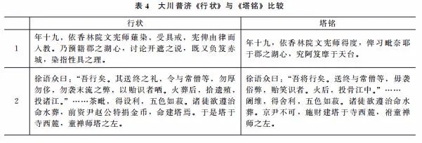 首先來看,從行狀到塔銘普濟(jì)的生平信息發(fā)生了哪些變化?通過對(duì)比發(fā)現(xiàn),除了文本形式(如行狀只敘不銘,而塔銘則有敘有銘)、語言表達(dá)不同之外,有些史實(shí)也發(fā)生了變化(見表4)。