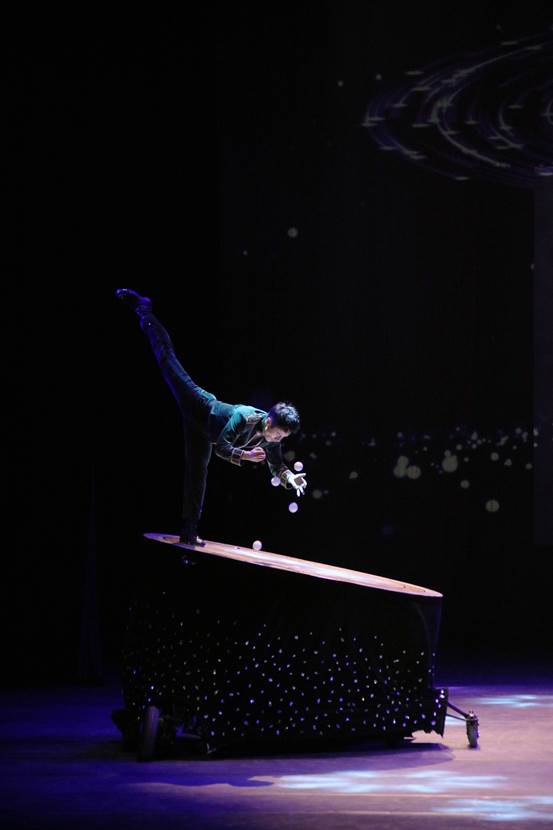 雜技主題晚會(huì)《我和我的青春—青春ing》匯聚了中雜70年享譽(yù)世界舞臺(tái)、拿遍海內(nèi)外大獎(jiǎng)的精品節(jié)目,除了根據(jù)時(shí)代主題和觀眾審美重新進(jìn)行編創(chuàng)為一大亮點(diǎn)之外,由中國(guó)雜技團(tuán)總工程師王建民設(shè)計(jì)的球技節(jié)目圓桌道具重裝亮相,引人關(guān)注?!队曛锌裣搿蚣肌分械膱A桌道具被打造為可以不斷“自轉(zhuǎn)”,同時(shí)圍繞舞臺(tái)“公轉(zhuǎn)”,甚至還能傾斜的移動(dòng)袖珍舞臺(tái)。演員將在不斷轉(zhuǎn)動(dòng)的圓桌上,隨時(shí)調(diào)整身體姿態(tài)保持平衡的同時(shí),讓手里的多個(gè)球反彈拋接,難度之大,令人嘆為觀止。這種創(chuàng)新和突破也體現(xiàn)出中國(guó)雜技團(tuán)作為國(guó)內(nèi)領(lǐng)軍團(tuán)體在推動(dòng)技巧、道具等多方面雜技藝術(shù)創(chuàng)新路上的自信和實(shí)力。