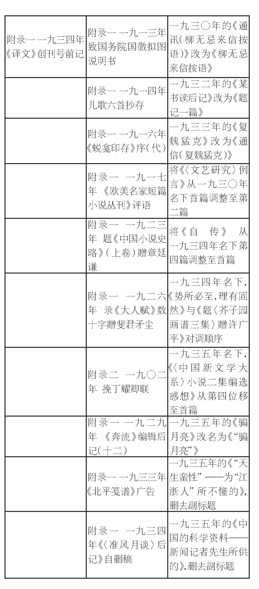 調(diào)整篇目位置14篇(其中3篇同時改名),指將文章在正文與附錄一之間對調(diào),數(shù)量雖少,卻頗具討論空間。其中從正文轉(zhuǎn)為附錄一的4篇,從附錄一轉(zhuǎn)為正文的10篇。結(jié)合篇名與文章內(nèi)容,大致可以判斷對調(diào)的原因。由正文轉(zhuǎn)為附錄一的多是應(yīng)用文體,包括宣言、編目、廣告、啟事等。附錄轉(zhuǎn)為正文則更強調(diào)文學(xué)性,需要“相對成文”。10篇中有7篇都是題記,盡管短小,卻很雋永,自成一體。如《題〈陶元慶的出品〉》睹物思人,寄托哀思懷念,感情真摯強烈?!额}〈淞隱漫錄〉》等四篇介紹古籍版本源流、考訂異同,已形同書話。其他三篇,《聞小林同志之死》近似于悼念詞和聲明的復(fù)合體?!丁催h方〉按語》《〈中國杰作小說〉小引》兩篇則實際是序跋。