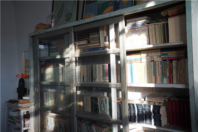 午后陽光照射到室內(nèi)滿是舊書的書架上