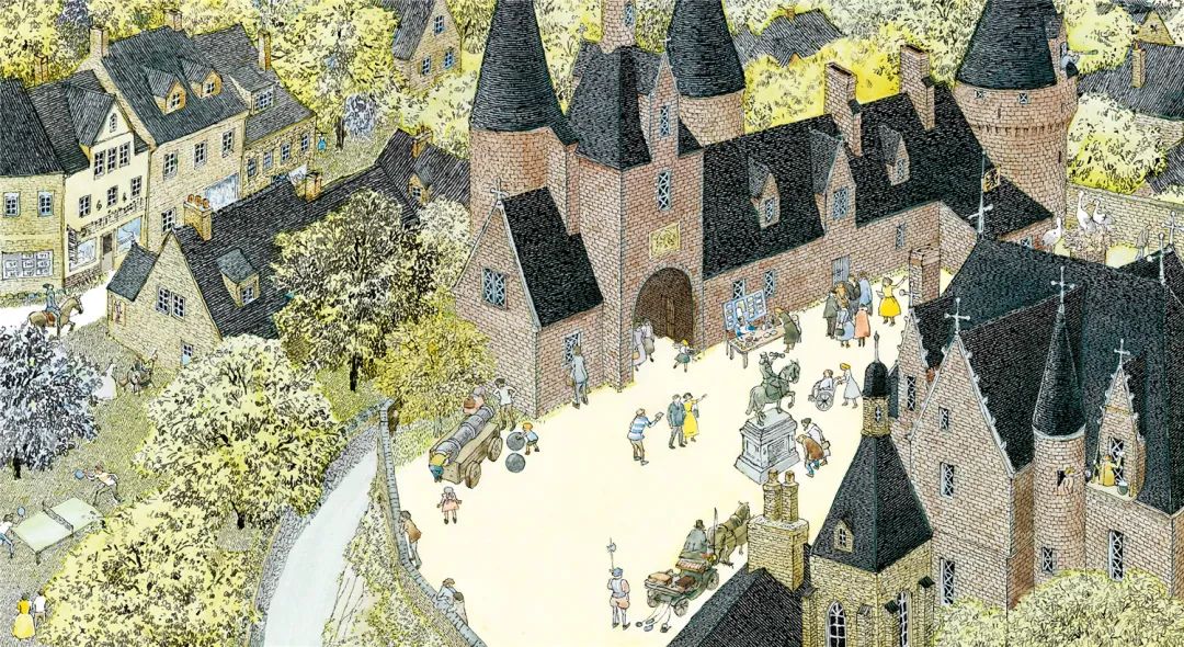1977年《旅之繪本》系列第一冊“中歐篇”出版時,安野光雅51歲;2018年《旅之繪本IX》(瑞士篇)出版,此時,安野光雅已經(jīng)92歲,他用半生的時間繪制了一幅動人的世界長卷。在這幅畫卷中,他以鳥瞰的視角描繪出了東西方獨(dú)具特色的風(fēng)景,在風(fēng)景之中,隱藏著更為豐富有趣的內(nèi)容:文學(xué)名著、名人畫作、經(jīng)典電影、建筑古跡……