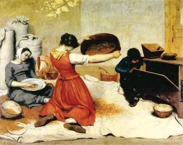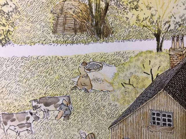 他在繪本當(dāng)中也為讀者藏了數(shù)不盡的驚喜,《旅之繪本》當(dāng)中藏了數(shù)不清的名畫,如鄉(xiāng)間的小路邊,一個婦人在家門前篩著谷子,而看似是無心之筆,其實則是居斯塔夫的一幅名畫《篩谷的婦女》。