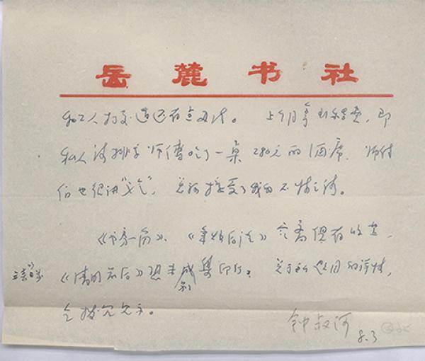 此札雖短,但歷史的信息頗為豐富。信的開(kāi)頭先解釋了《木片集》書名的出處,繼而相告正在約黃裳編《周作人集外文編》。信中雖明示發(fā)排和出書的大致時(shí)間,但最終黃裳并未應(yīng)承此事,而是改由陳子善完成了這個(gè)選題,即1988年岳麓書社出版的《知堂集外文·〈亦報(bào)〉隨筆》和《知堂集外文·四九以后》。接著又告知《知堂序跋》的付排及其相關(guān)內(nèi)容,最有意思的當(dāng)屬“私人請(qǐng)排字師傅吃了一桌二百八十元的酒席”,師傅們于是很講“義氣”,總算接受了鍾叔河陸續(xù)將新發(fā)現(xiàn)的集外佚文插入排字的不情之請(qǐng)。此外,從此信的上款推測(cè),谷林或許就是經(jīng)由秦人路的介紹才與鍾叔河開(kāi)始通信的吧。