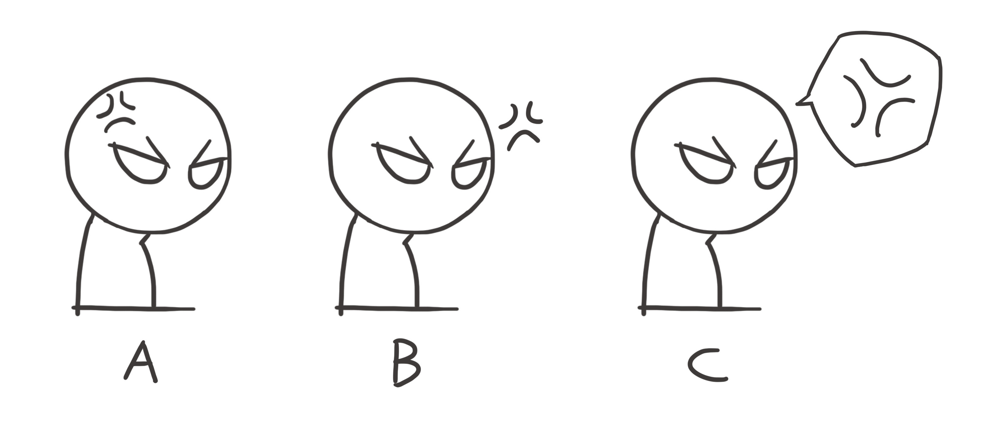 乍看上去,似乎以上這些表情元素都是肖似符號;但實際上,一些符號已經(jīng)發(fā)生了朝向象征屬性的偏移。這偏移所產(chǎn)生的一類非常典型的現(xiàn)象便是,這些表情元素的出現(xiàn)常常忽視了元素本應(yīng)所處的空間位置——青筋不以“恰當(dāng)”的位置出現(xiàn)在額頭,可以畫在頭發(fā)表面,可以畫在腦袋旁邊,甚至可以被置于對白框中(如圖2);表示冷汗的一排豎線常常占用很大空間,還能直接作為背景……在這里,表情元素的使用方式徹底發(fā)生了變化,用法與文字類似,成為一種便于援引的象征符號。尤其是在對白框中的情況,儼然將視覺性的表情元素直接用作文字,暴起的青筋就這樣成了“沒有讀音的字詞”。它們跨越了肖似與象征的鴻溝,可以說同時具有肖似與象征兩副面孔。