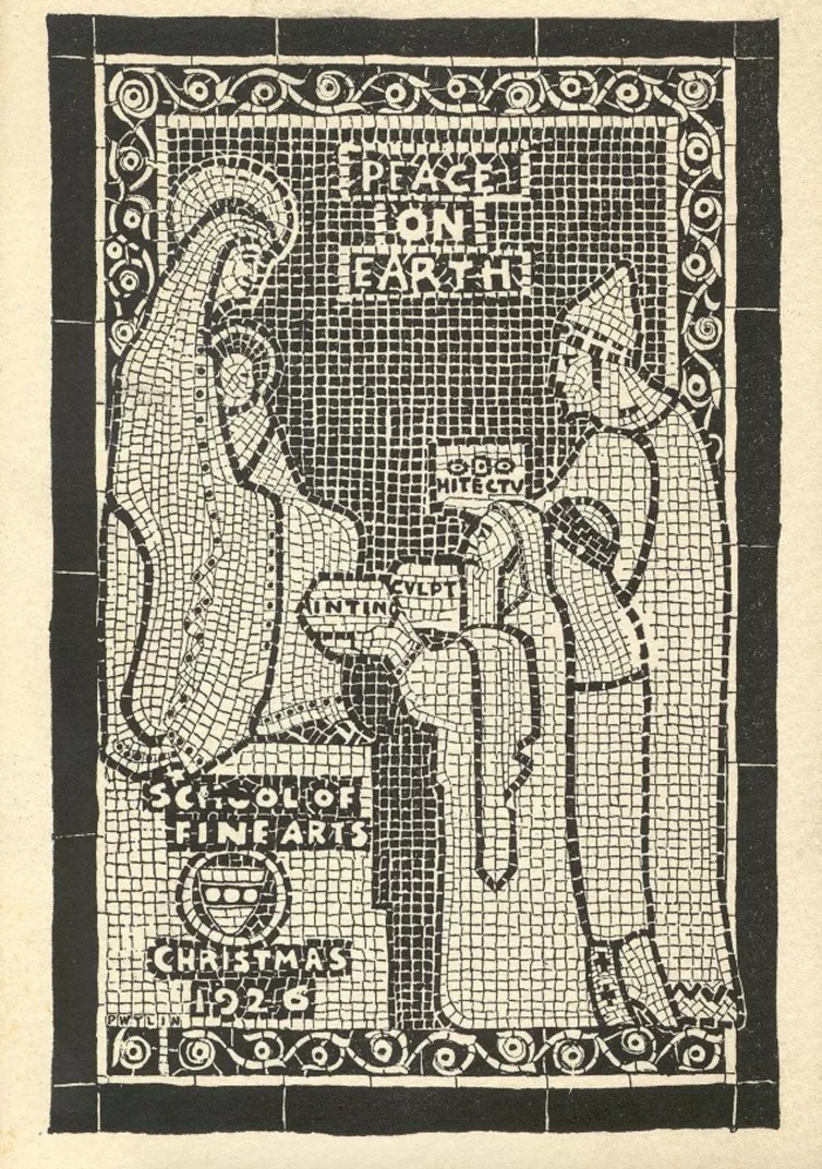 林徽因在賓大時(shí)就展露出設(shè)計(jì)方面的才華。1926年,她為美術(shù)學(xué)院設(shè)計(jì)了一張圣誕卡,采用馬賽克鑲嵌畫的風(fēng)格,有點(diǎn)羅馬或者拜占庭的味道。畫中東方三博士手持禮盒上的字是painting(繪畫) sculpture(雕塑)和architecture(建筑),寓意造型藝術(shù)三姐妹。據(jù)梁再冰回憶,林徽因和梁思成還為此吵了一架。林徽因說(shuō)這是她的創(chuàng)意,希望自己畫出來(lái);但梁思成覺(jué)得自己畫得更好,應(yīng)該由他來(lái)畫。林徽因說(shuō)不行,大家都能看出這是你畫的,到時(shí)候我就穿幫了。
