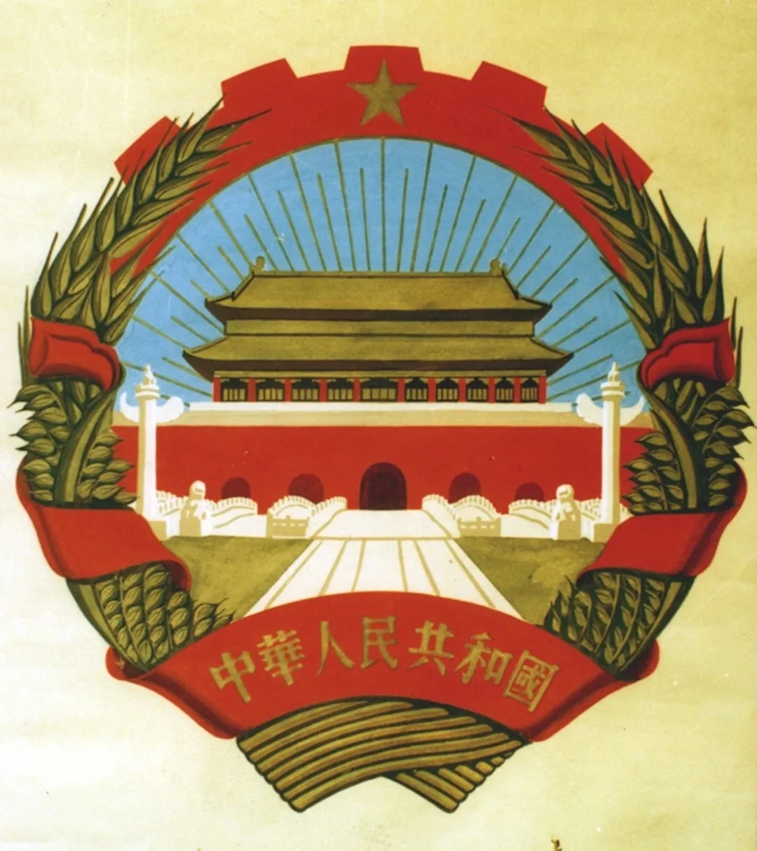 這是稍晚由美術(shù)家張仃先生等提交的方案,是一個(gè)帶天安門形象、繪畫風(fēng)格的國(guó)徽。