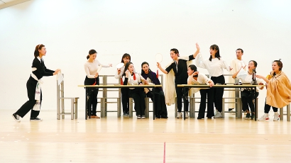 2019年底,喻榮軍編劇、中央戲劇學(xué)院教授曹艷執(zhí)導(dǎo)的《紅樓夢(mèng)》進(jìn)入籌備期。2020年8月,進(jìn)入第一階段工作坊,近20位演員一起探索《紅樓夢(mèng)》話(huà)劇表現(xiàn)方式?!拔覀冇昧藘扇陮ふ倚问剑袀鹘y(tǒng)元素,又要有當(dāng)代性,不是簡(jiǎn)單的復(fù)制和堆砌?!庇鳂s軍以演員“怎么走”為例,“肯定不是穿著高跟鞋的走法,但也不能變成戲曲臺(tái)步。我們需要找到平衡,嘗試形成話(huà)劇、戲曲、現(xiàn)代舞交合而成的角色身韻?!薄都t樓夢(mèng)》工作坊請(qǐng)來(lái)上海昆劇團(tuán)演員教大家戲曲形體動(dòng)作,包括云手、提步、圓場(chǎng),講解戲曲中的舉手抬足。大家常常為一個(gè)動(dòng)作的精準(zhǔn)反復(fù)練習(xí)一下午,對(duì)著鏡子一遍遍拗造型,在角落揣摩如何每次抬手到同一角度,用左手調(diào)整著右手。