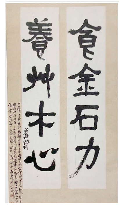 吳昌碩贈(zèng)予王個(gè)簃的隸書(shū)四言聯(lián)“食金石力,養(yǎng)草木心”