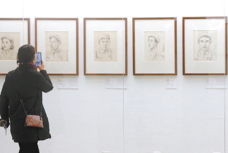 一幅幅英模人物的素描肖像引得觀眾駐足觀看。本報記者 饒強攝