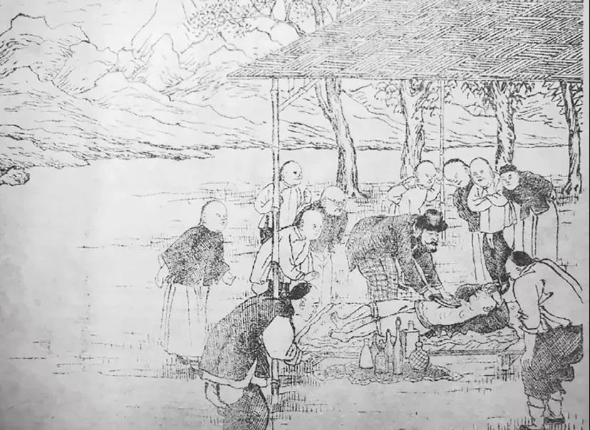 《點(diǎn)石齋畫報(bào)》利集三期“剖腦療瘡”配圖。《新法螺先生譚》中所描述的“旁立一人,手執(zhí)一器,器中滿盛流質(zhì)”場景與此圖頗為相似