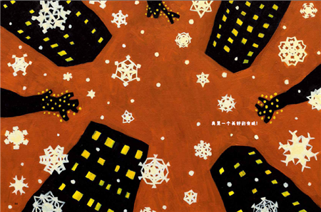作者在一幅幅色彩濃郁、筆觸細(xì)膩的油畫中加入了巧思,比如用不同的背景顏色去表現(xiàn)人物的心情,烘托環(huán)境氛圍;采用剪紙工藝表現(xiàn)不同形狀的雪花、腳印等事物,這些努力都讓圖畫的層次感更加豐富。