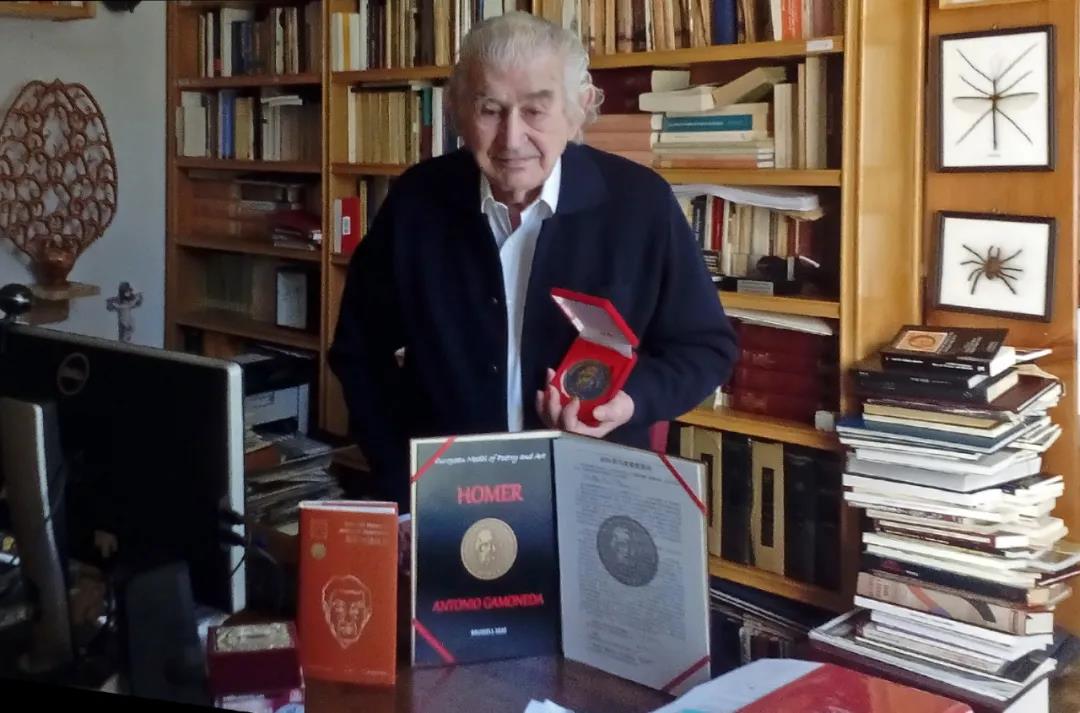 加莫內(nèi)達(dá)在位于西班牙萊昂市達(dá)瑪索·麥力諾路的家中收到荷馬獎(jiǎng)?wù)录啊都幽獌?nèi)達(dá)詩(shī)選》
