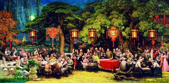 油畫《良宵》由畫家劉宇一于上世紀(jì)90年代創(chuàng)作。該畫生動(dòng)地再現(xiàn)了新中國成立后的第一個(gè)中秋之夜,黨和國家領(lǐng)導(dǎo)人、民主黨派人士及群眾代表共慶中秋夜的祥和景象,展現(xiàn)了黨和國家蒸蒸日上、民族團(tuán)結(jié)和睦、人民幸福安康的美好圖景。該作在中國美術(shù)史上有較大影響,至今仍陳列在毛主席紀(jì)念堂。