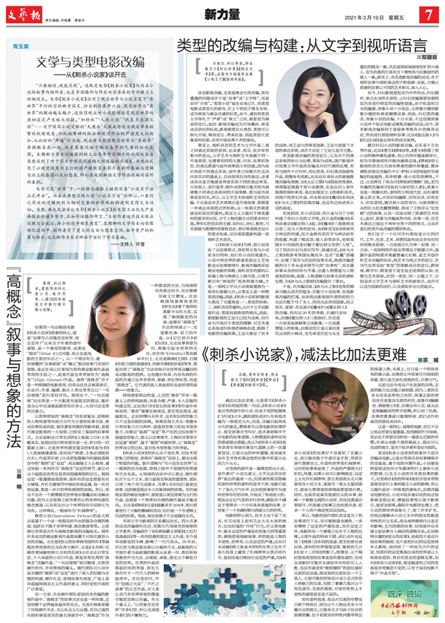 “只要相信,就能實現(xiàn)”。這既是電影《刺殺小說家》與同名小說的敘事內核所在,也是導演路陽與作家雙雪濤在創(chuàng)作內驅力上的相同點。電影《刺殺小說家》沿用了現(xiàn)實世界與小說家筆下“異世界”平行時空的新奇設定,但自劇情展開以后,現(xiàn)實世界與“異世界”的聯(lián)動越來越少,這使得觀眾對小說能夠改變現(xiàn)實世界的原初設定產生極大懷疑。“加特林”“人間大炮”“代表月亮消滅你”……關寧續(xù)寫小說突轉的“無厘頭”文風或許能為觀眾帶來短暫的玩梗爽感,但機械降神的做法卻使得作品的嚴謹度大打折扣,從此時的“開掛”行為起,觀眾便不愿將現(xiàn)實世界與“異世界”牽強聯(lián)系在一起,而更愿意沉湎于貼近春節(jié)檔氣質的狂歡氛圍。本期新力量專刊邀請到的三位青年作家都不約而同從各自角度談到了對于影片中現(xiàn)實同虛構之間連接的不滿足,并進而反思了以視覺效果為主打的國產超現(xiàn)實類影片在劇作基礎與邏輯自洽上的孱弱以及幻想類、科幻類或創(chuàng)新性文學作品改編同國外的差距。