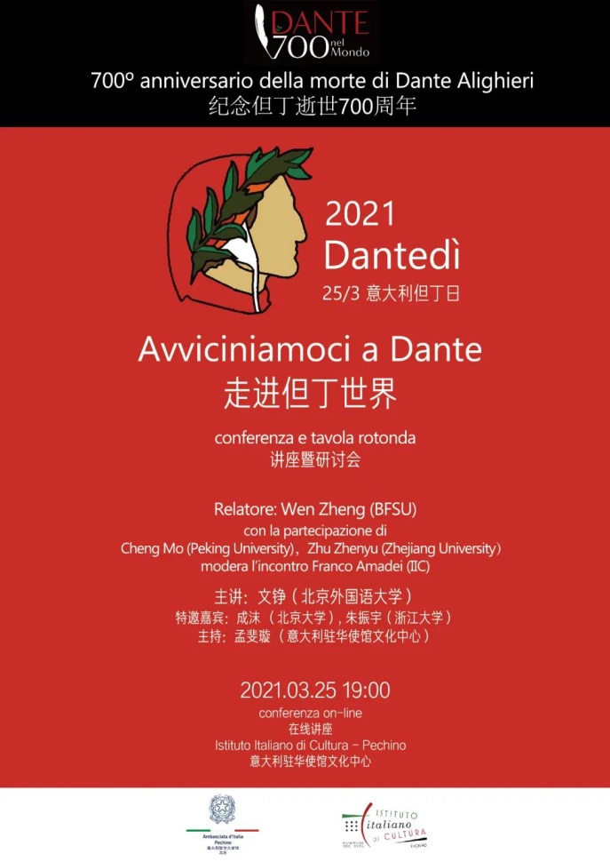 3月25日,意大利駐華使館文化中心和北京外國語大學(xué)意大利研究中心合辦的“走進但丁世界”講座暨研討會在線上舉行。意大利駐華使館文化參贊孟斐璇(Franco Amadei)、北京外國語大學(xué)教授文錚、北京大學(xué)意大利學(xué)專家成沫、浙江大學(xué)副教授朱振宇等參加紀(jì)念活動。