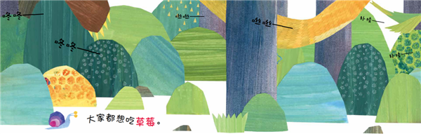《好想好想吃草莓》講述了一只有勇氣、有毅力的小蝸牛想吃草莓的故事。一只小蝸牛出發(fā)尋找草莓,一路上,它遇見(jiàn)一只又一只動(dòng)物,它們都勸小蝸牛不用去了,因?yàn)樗鼈儧](méi)有找到草莓。經(jīng)過(guò)一番考慮,小蝸牛還是決定繼續(xù)尋找草莓。不分白天和夜晚,不管晴天還是雨天,它仍然堅(jiān)持趕路。終于,小蝸牛越過(guò)山丘,看到了一大片又大又紅的草莓。