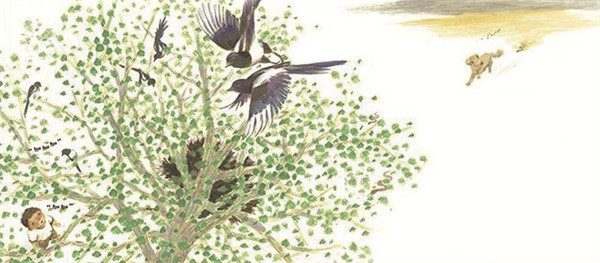 不得不說,在我們的故事型原創(chuàng)繪本中,存在著不少不會講有結(jié)構(gòu)的故事的作品。故事講不好,“小”繪本立不起來,更無法“大”起來。在這個重要方面,《喜鵲窩》給我們提供了一個難能可貴的經(jīng)驗。