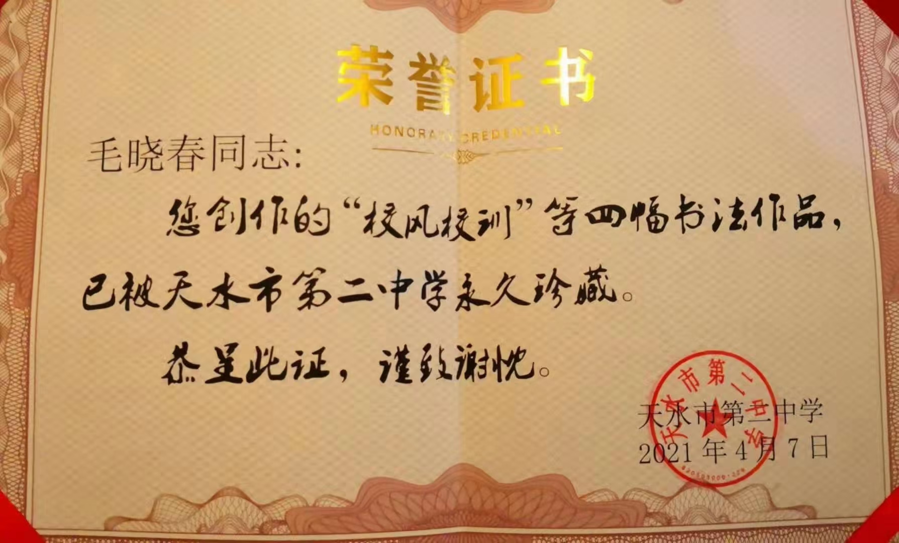 天水市二中坐落在甘肅省天水市麥積區(qū)馬跑泉古鎮(zhèn),始建于1953年,原名“天水縣第一中學(xué)”,1986年改稱“天水市第二中學(xué)”,是一所區(qū)屬省級(jí)示范性普通高中。2009年9月被省教育廳確定為“甘肅省高中新課程樣本學(xué)校”。2012被評(píng)為甘肅省“教育系統(tǒng)先進(jìn)集體”、“甘肅省綠色學(xué)?!薄资陙?,這所學(xué)校為國(guó)家輸送了許多優(yōu)秀人才。天水籍學(xué)者、作家、金石書法家毛曉春曾就讀于這里,1992年,毛曉春走出二中的校門,開始了他坎坷的游學(xué)生涯,經(jīng)過不斷的努力和成長(zhǎng),三十年后,已在京華事業(yè)有成毛曉春回到母校,在校領(lǐng)導(dǎo)的陪同下參觀了學(xué)校的基礎(chǔ)建設(shè)和文化建設(shè),把自己創(chuàng)作的部分作品捐贈(zèng)給母校,并在“博雅”大講堂上為學(xué)校高一高二的師生做了“守望家園 傳承文化”的專題講座。
