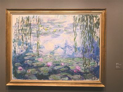 本展最后專設一廳,將瑪摩丹莫奈博物館收藏的八件莫奈晚年大幅作品安放于四周墻上,觀眾可以坐在中央圓形圈凳上靜靜環(huán)顧。從右到左分別是《鳶尾花》(1924-1925),《玫瑰》(1925-1926年),三幅《睡蓮》(1916-1919年),兩幅《日本橋》(1918年),《紫藤》(1919-1920年)。
