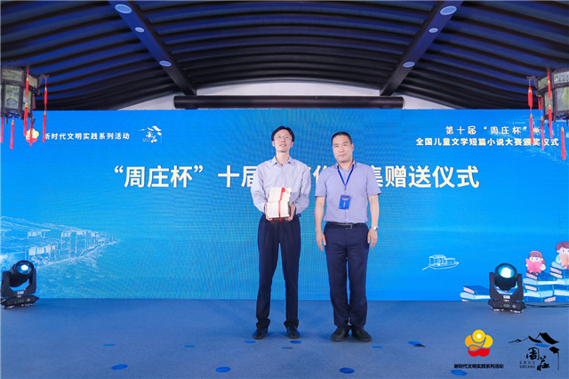 陸小新代表少年兒童出版社向周莊鎮(zhèn)人民政府贈送周莊杯十屆獲獎作品集