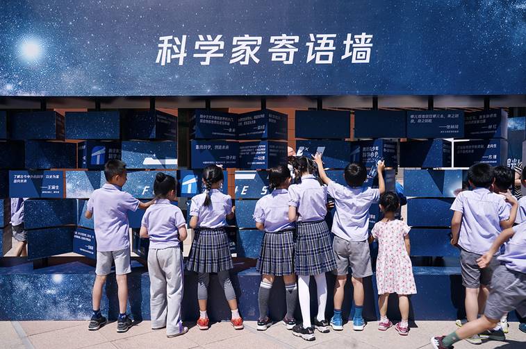 孩子們?cè)隍v訊青少年科學(xué)小會(huì)現(xiàn)場(chǎng)駐足瀏覽百位科學(xué)家的寄語(yǔ)