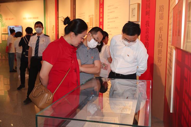 開幕式后,鐵凝、錢小芊和參加開幕式的所有人員步入展廳參觀展覽。展覽的第一部分是“1921年·時代的聲音”,魯迅的《故鄉(xiāng)》、郭沫若的《女神》、郁達夫的《沉淪》等作品展現(xiàn)了五四那一代作家對時代與現(xiàn)實的敏銳把握。隨后,“左聯(lián)五烈士”的散文和詩作、方志敏的《可愛的中國》、茅盾的《子夜》、巴金的《家》、艾青的《我愛這土地》、老舍的《四世同堂》等作品的相關(guān)手稿、書籍依次映入眼簾,其中蘊含著青春的熱血與激情,以及作家們對祖國和人民的深厚情感?!饵S河大合唱》《小二黑結(jié)婚》《太陽照在桑干河上》等相關(guān)展品則勾連起解放區(qū)文學(xué)的昂揚基調(diào)。1949年新中國成立,文學(xué)的氣象也隨之翻新,展覽通過胡風(fēng)、臧克家、何其芳等人的詩作片段,以及關(guān)于第一次文代會的照片等展品展現(xiàn)新中國文學(xué)的新起點。關(guān)于上世紀(jì)五六十年代的文學(xué),展覽展出了《紅巖》《紅日》《紅旗譜》《創(chuàng)業(yè)史》《青春之歌》《保衛(wèi)延安》《乘風(fēng)破浪》等長篇小說和魏巍的散文《誰是最可愛的人》、賀敬之的詩歌《雷鋒之歌》等作品,一本本珍貴的初版書和一頁頁帶著靈韻的作家手稿彰顯著紅色經(jīng)典的魅力。展覽以徐遲、周克芹、路遙和王蒙、蔣子龍、張潔、舒婷等作家的作品為例,展現(xiàn)了新時期文學(xué)與時代同頻共振的特質(zhì)?!靶聲r代 新征程”板塊則以視頻的形式聚焦“百年路新征程詩歌創(chuàng)作工程”的成果,以及作家、詩人們對于新時代文學(xué)的展望。